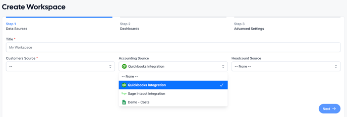 To add the QuickBooks data to a new workspace, navigate to the Workspaces tab on the left pane and click on + Workspace in the top right corner. Select the QuickBooks integration as the accounting Data Source. Once the workspace is created, you'll be able to add the QuickBooks integration to the workspace.