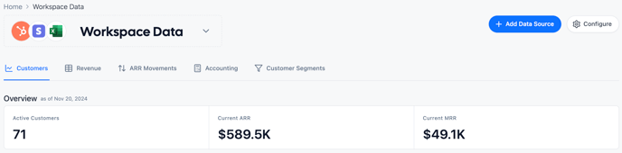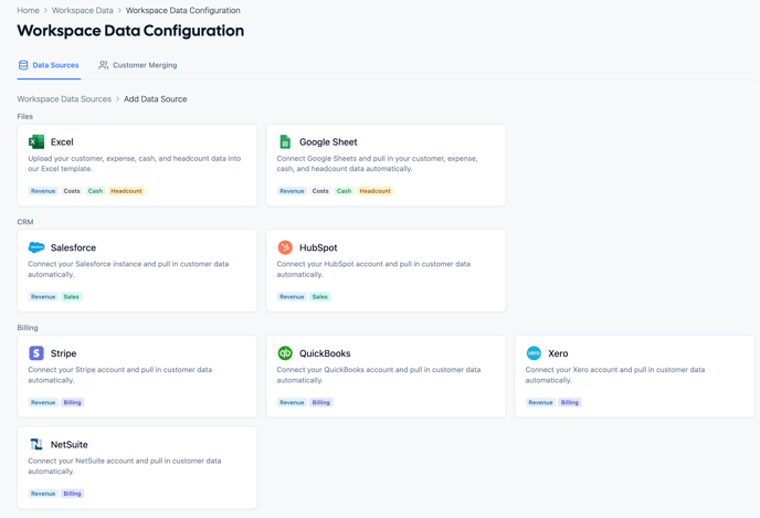 SaaSGrid pulls revenue, sales, costs, billing, costs, cash, and headcount data from different sources into workspaces. Each data source can unlock metrics in SaaSGrid, and multiple data sources can be used to calculate composite metrics.