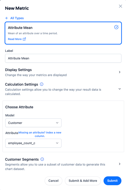 Under Calculation Settings, specify the metric that needs to be averaged. First, select the model of the attribute: this can be at the customer-level, deal-level, or any other data model that SaaSGrid has created. Second, select the attribute in the dropdown. If you do not see your metric, you can click on Missing an attribute? Index a new column. to add in a new attribute metric, or check if the attribute is on another model (e.g. a customer-level attribute instead of a deal-level attribute). Click Submit to generate the chart.