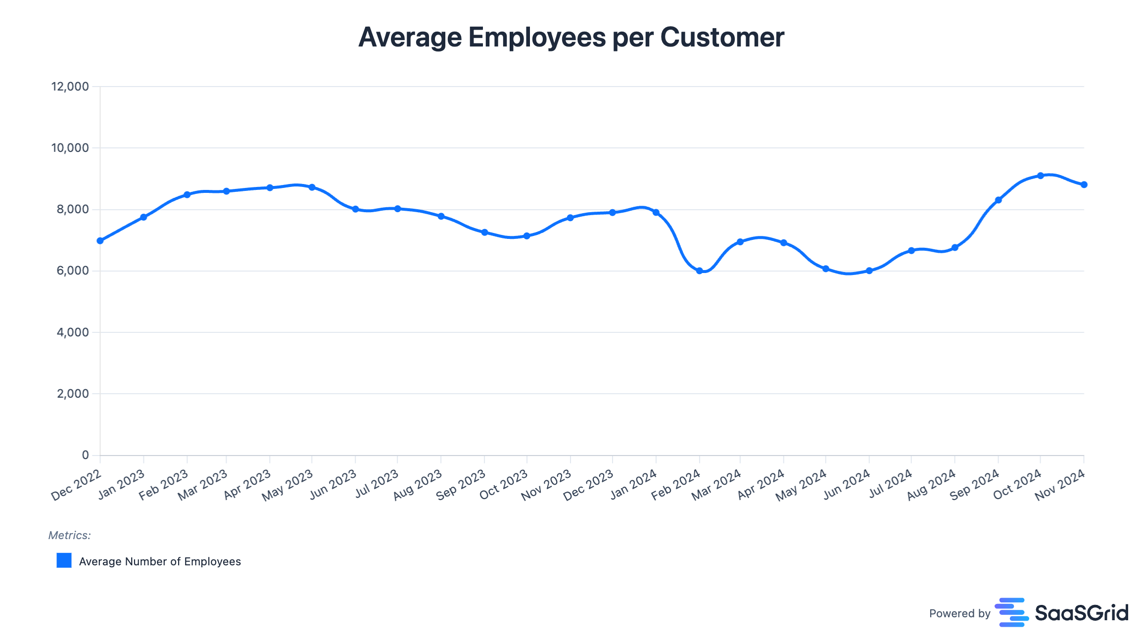 The chart details the average number of employees for all customers during that period. Like other charts in SaaSGrid, selecting any data point will show the customers that are incorporated into the data during that period.