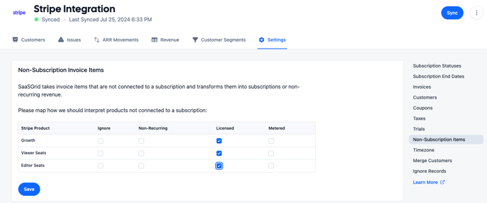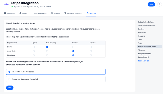 - For each Stripe Product, select how SaaSGrid should treat revenue from the product. SaaSGrid will recognize the revenue based on the following methodology: