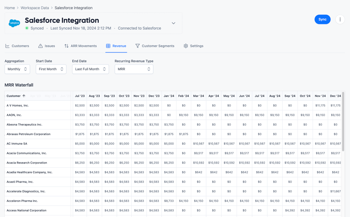 The Revenue tab breaks down your customer contracts into monthly revenue. You can adjust for your date range, aggregation, and whether you want your revenue to be reflected in MRR or ARR.